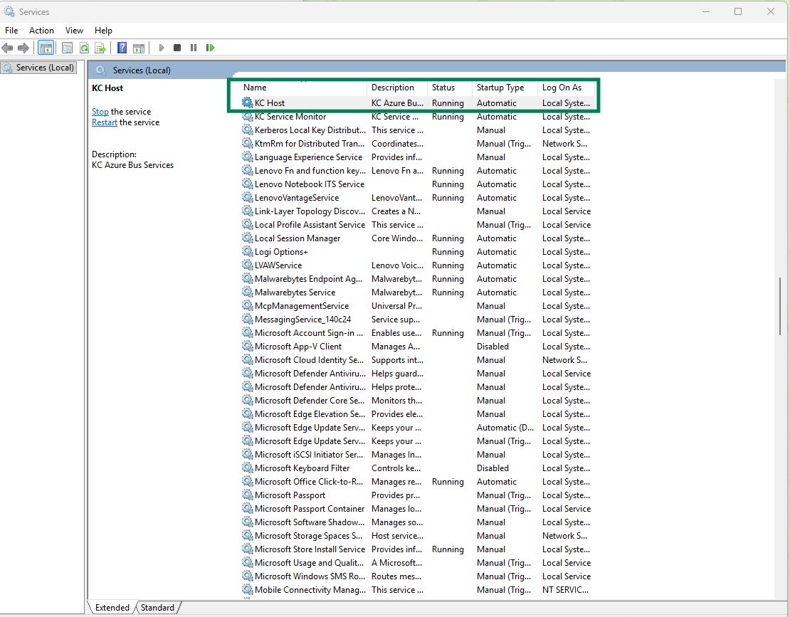 If you have gone through all the above, you can check to see if the KCHost service is running. On your host computer press the windows key + S and type in "services.msc" without the quotes and click on the services search result. Click on any service and press the letter K to jump down to the K section and you'll see KCHost. Look over to the right under the "status" column and it should say Running. If it does not, try right clicking on KCHost and choose start. If it starts successfully, try logging in to Live Access again. If it fails to start, please contact Support@kennelconnection.net.