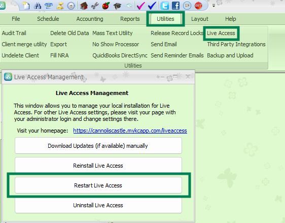 If your computer is powered on, you have Internet connection and KC desktop opens fine, inside Kennel Connection desktop, click on Utilities, Live Access. Inside the Live Access control panel, click on "Restart Live Access"