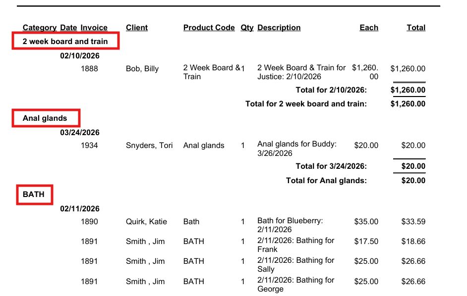 The schedule can be sorted by pet name, last name, service name or in time. You can also filter by employee name.