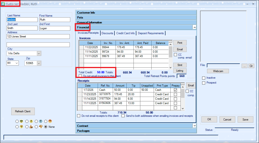 The prepayment/credit will appear on the Client Card → Financial tab, where it can be applied to future invoices.