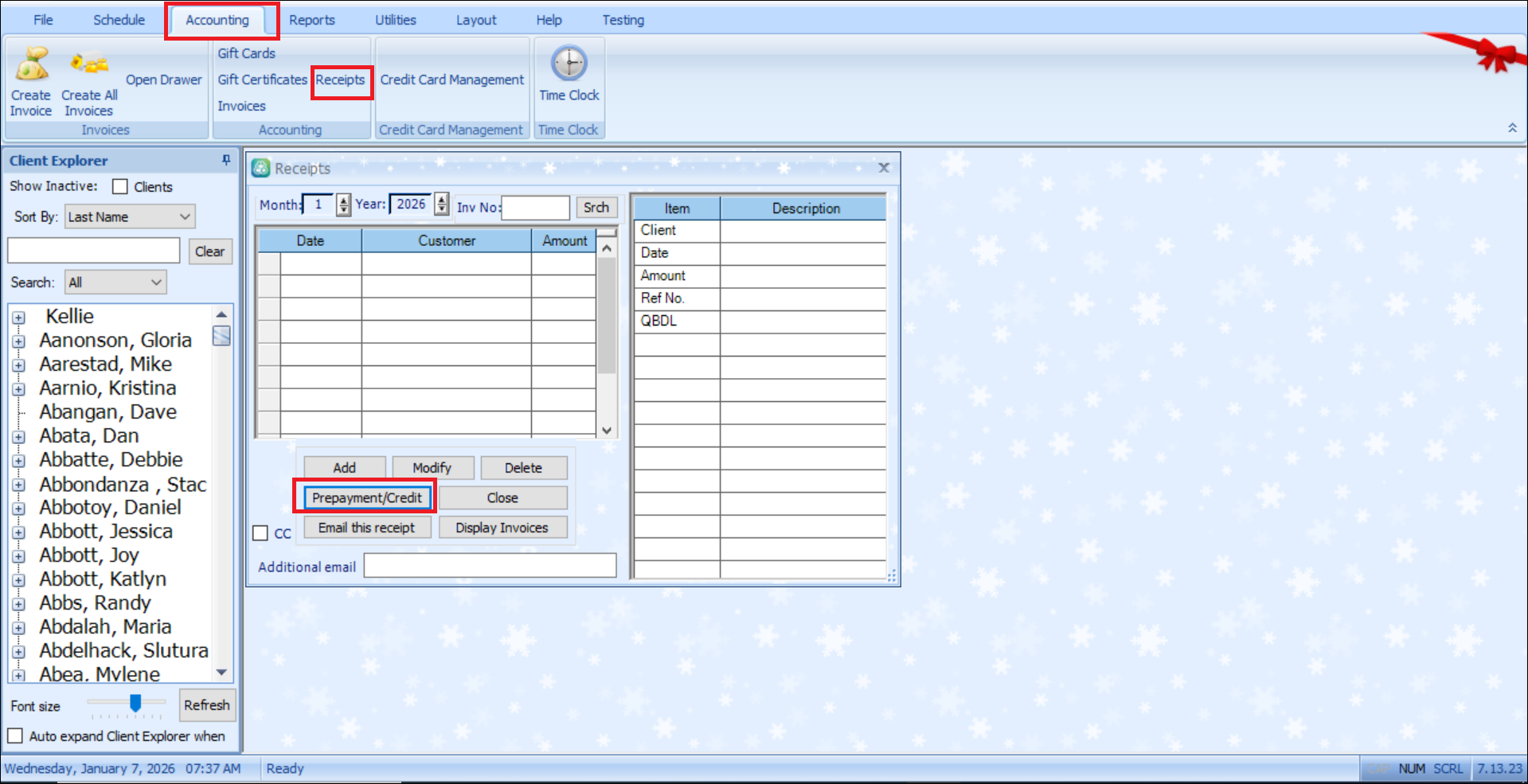 Go to Accounting → Receipts → Prepayment/Credit. From this screen, you can add unlimited Credits / Prepayments / deposits or credits to a client account.