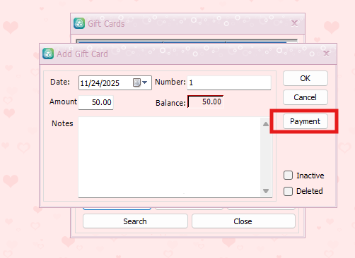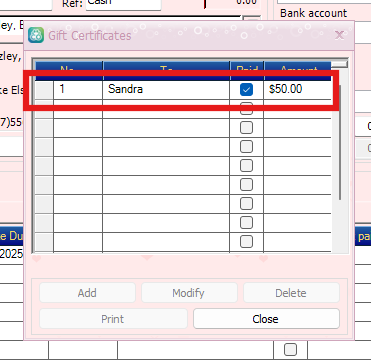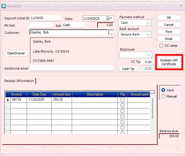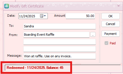You can issue and redeem gift cards and gift certificates, which can be used like cash to pay for an open invoice. You can create both without taking payment so it's a good option if you want to put a credit on a client's account, or if you're having an open house and giving away gift cards/certificates.