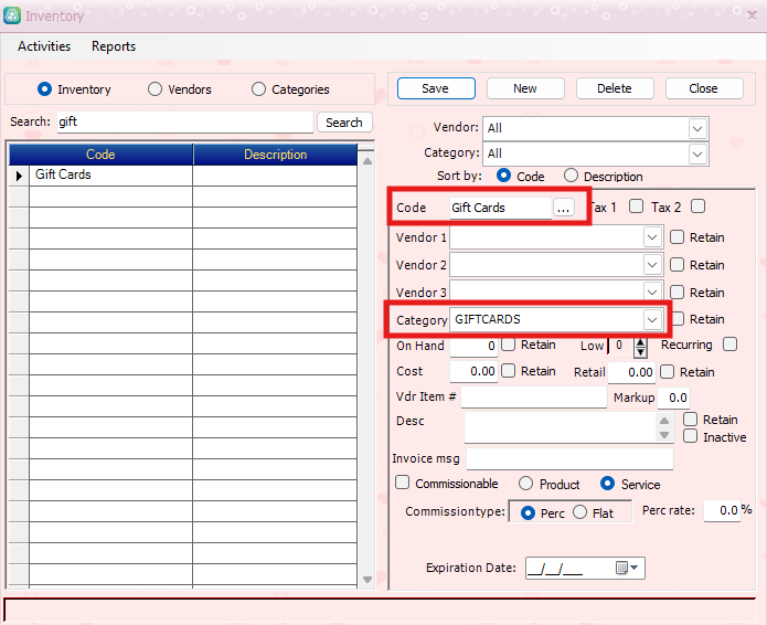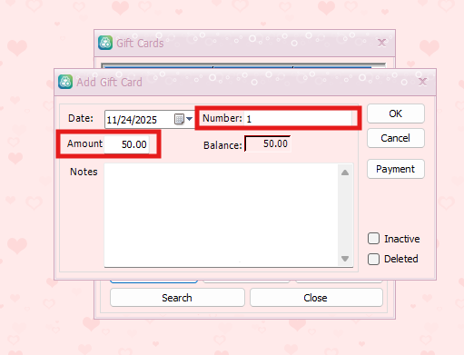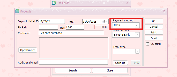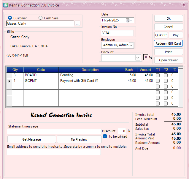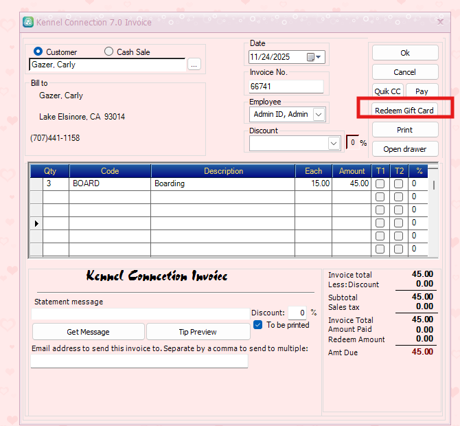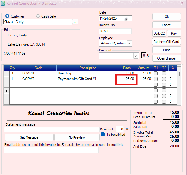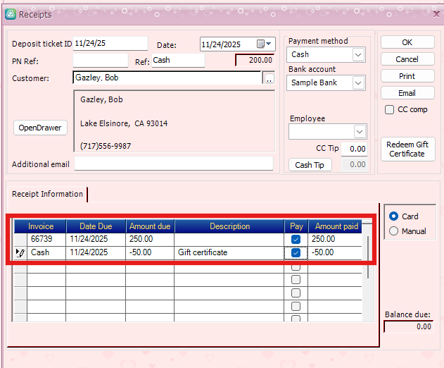 Enter the gift card number or name you used. Hit OK and this will show as a line item on the invoice.