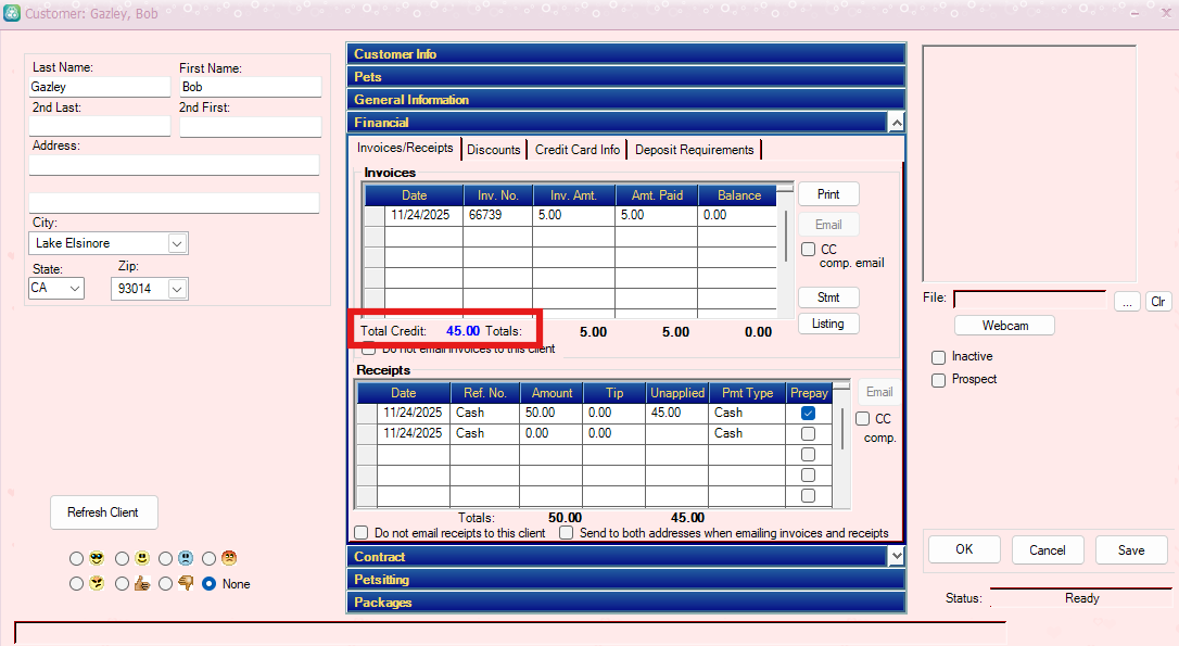 Any credit left over will show on the client's card, Financial tab. In this example, there is still $45 left on the certificate.