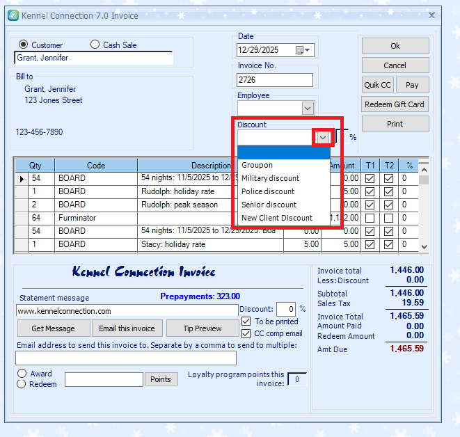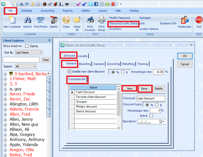 You have the option to set up long term discounts for boarding stays. Click on File, Discount/Loyalty setup. Click on Boarding, Long Term tab. Set your options on the screen below. You can enter up to 3 discounts. This is a tiered system. KC will not ...