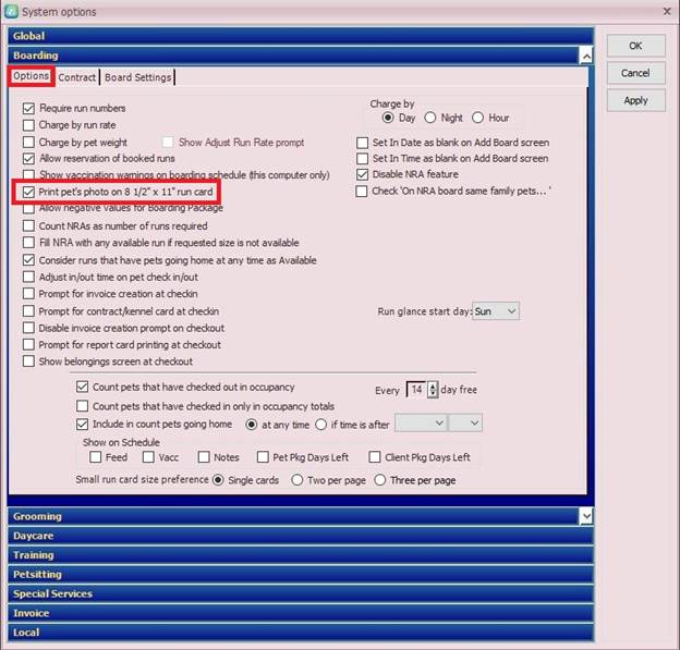 You have two different types of cards to run for boarding pets. The Kennel Card gives the options for three different sizes (8.5x11, 4x6 and 3x5). Depending on the size you choose, it will display warnings, notes, vaccine dates, feedings, meds, ...