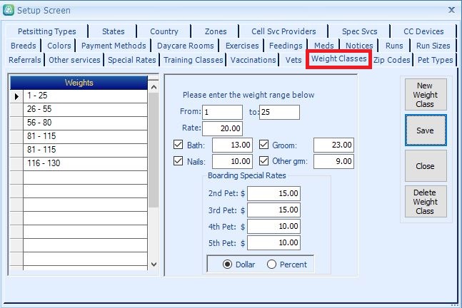 Enter the weight range, 1st pet rate and the multipet rates (2nd - 5th pet).