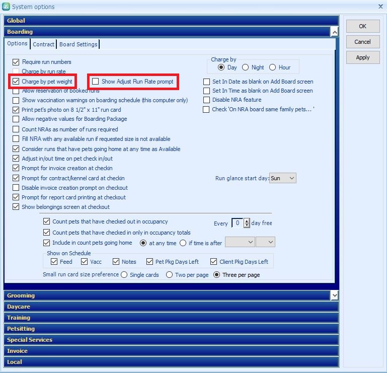 There is also an option called "Show adjust run rate prompt". Let's say you have rates setup for your runs. If your pet's weight class charge is $45 but you choose a run with a different rate, you can turn on the prompt so KC asks which rate do you want to use. Here is what it will ask.