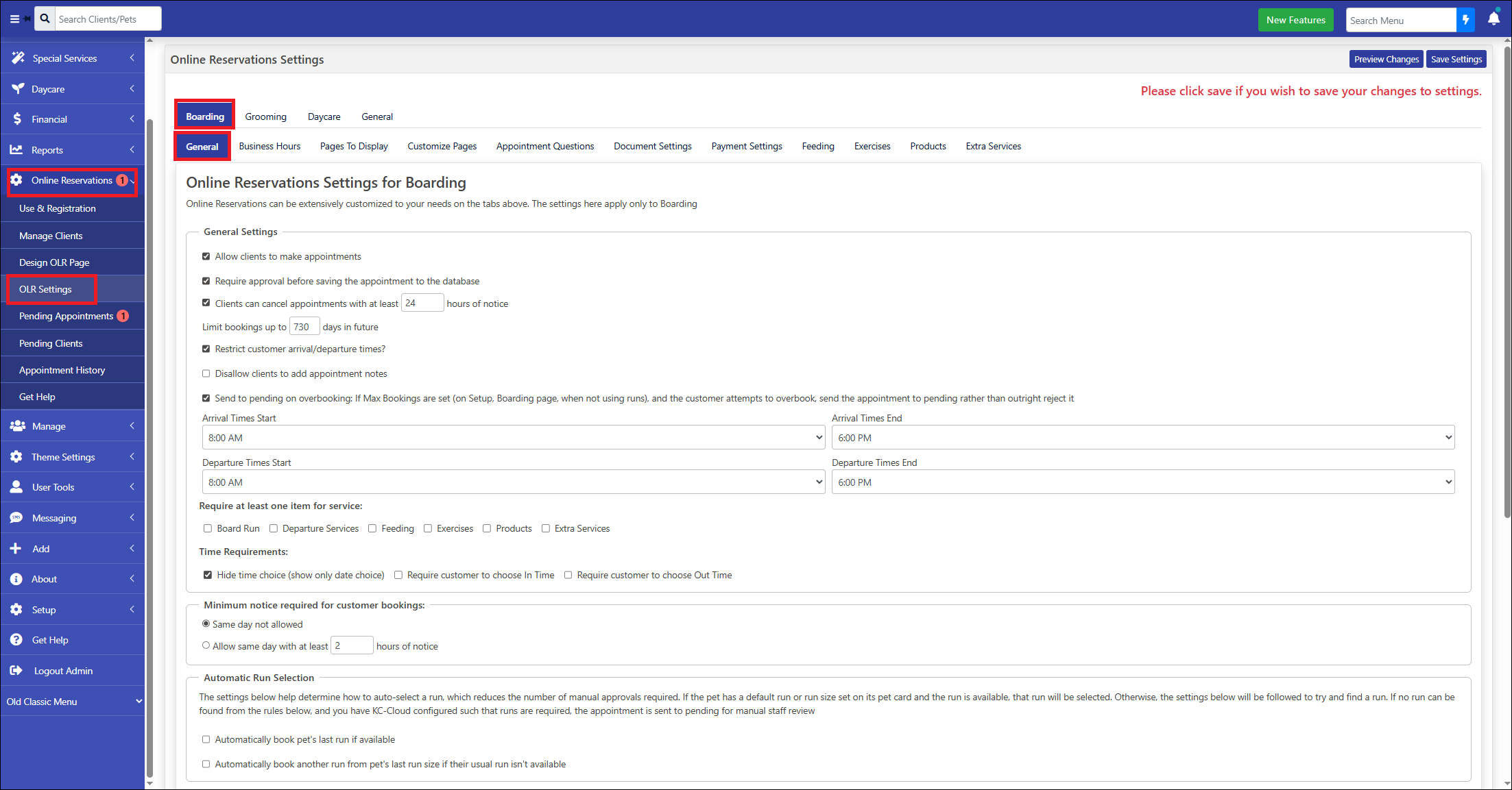 Allow clients to make appointments. This option enables or disables the ability for your customers to choose "Boarding" in the OLR system. If you need to turn Boarding OLR off for any reason, uncheck and save.