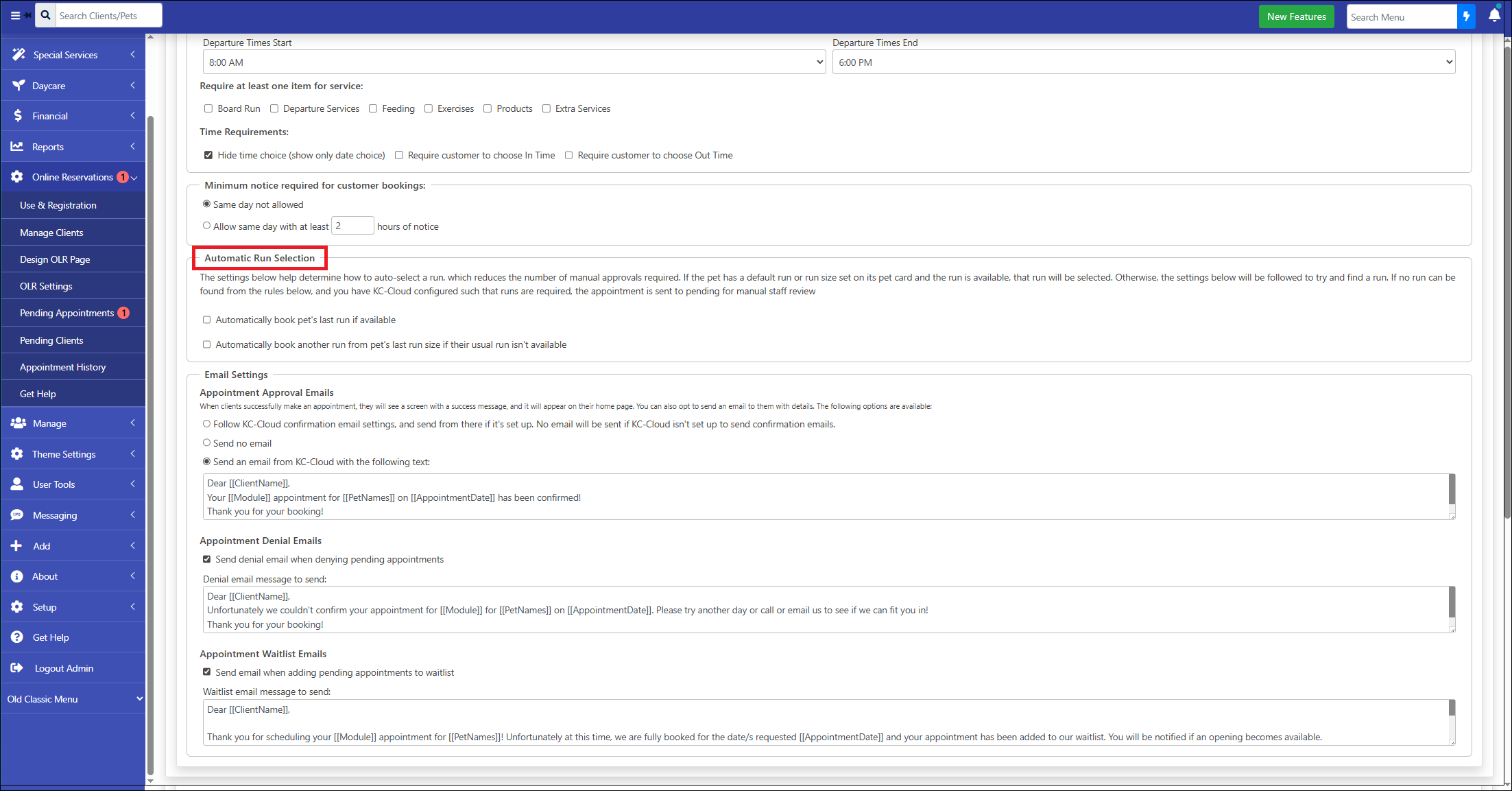 Automatically book client's last run if available. This option if enabled will attempt to automatically place your pet in the last run he/she stayed in if it is available.