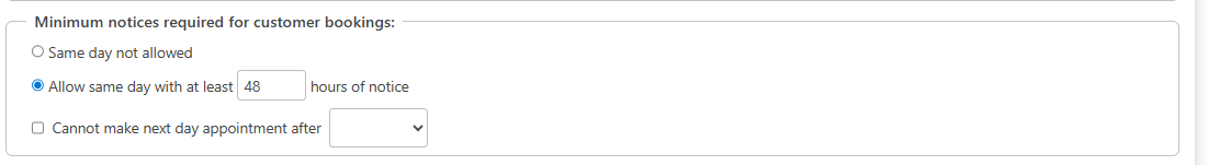Allow same day with at least ___ hours of notice. If selected and set, this will require this much advance notice to create a booking. Example: If enabled and set to 1 and its 9:00am your customers will not be able to book an appointment until 10:00 or after.