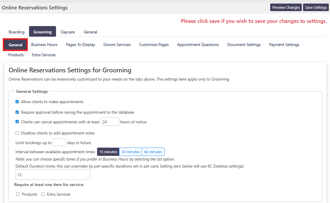 Allow clients to make appointments. This option enables or disables the ability for your customers to choose "Grooming" in the OLR system. If you need to turn Grooming OLR off for any reason, uncheck and save.