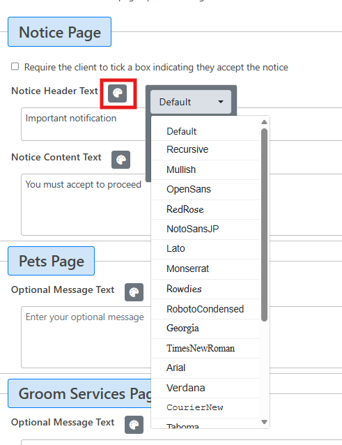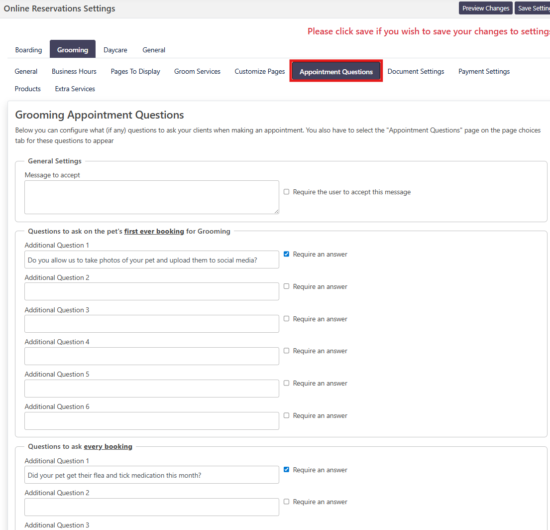 Here you can add a series of question that can be shown only on the pets first booking or whenever an appointment is made. Important note: In order for this to be displayed, you must choose this "Appointment Questions" page on the "Pages to Display" setting. Otherwise your customers will not see it.