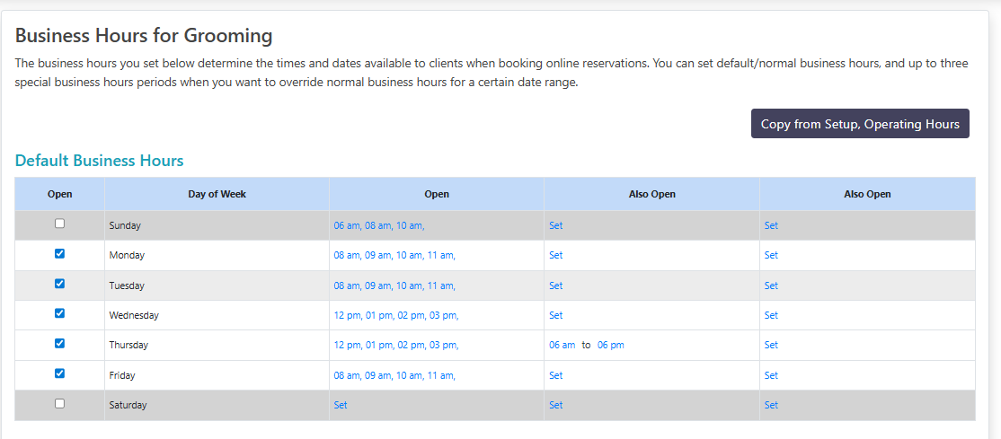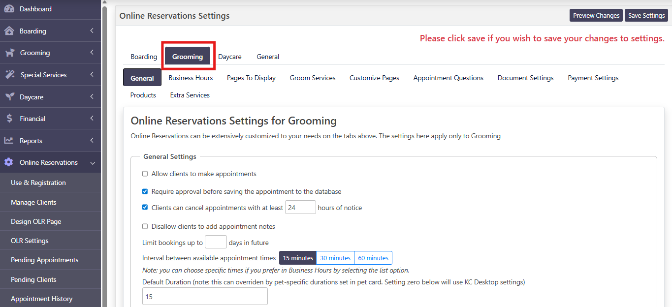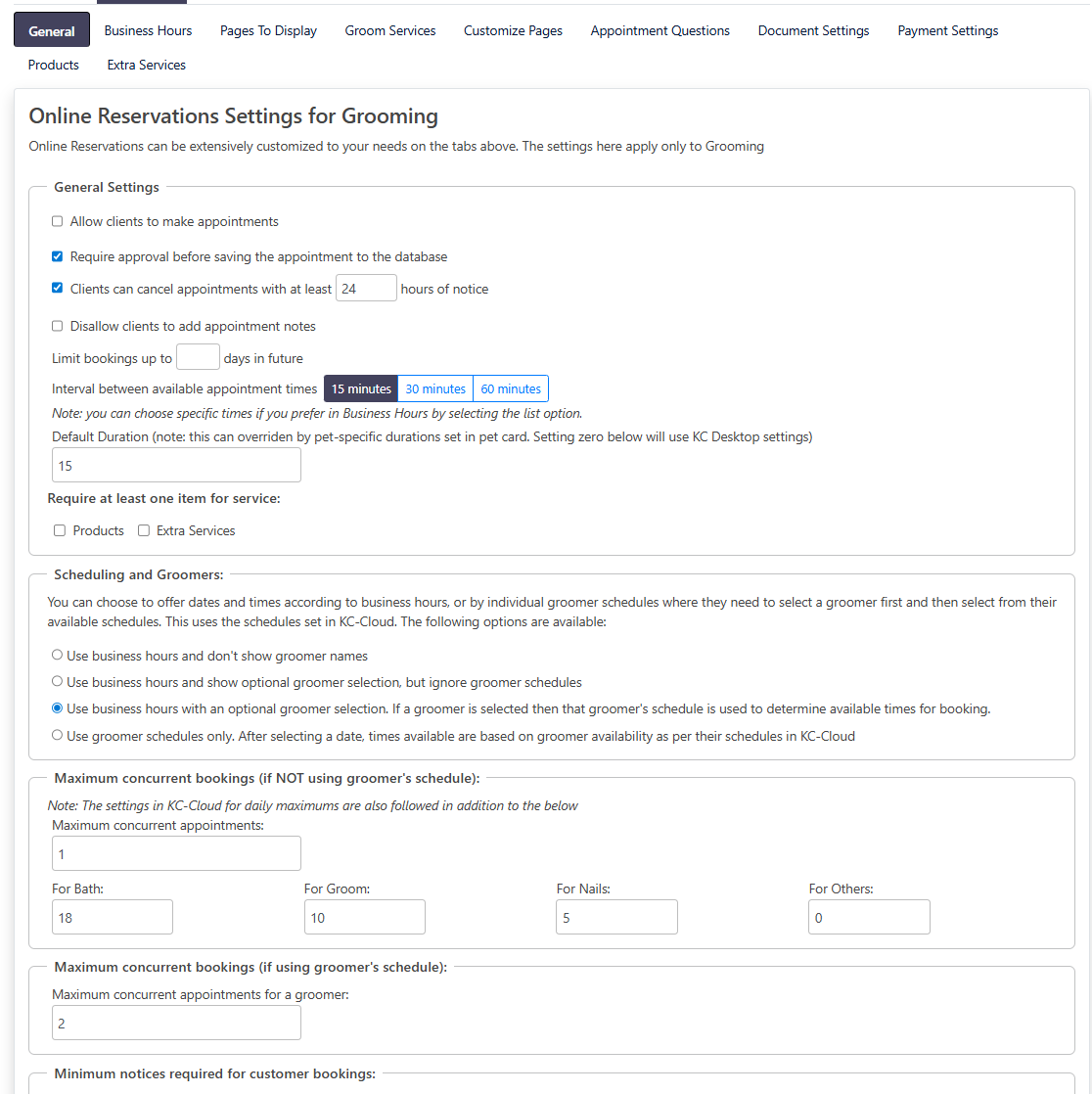 For more specific information on setting these General Grooming settings, please click here: OLR General Grooming Online Reservations Settings Explained