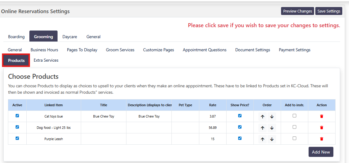 Here you can choose products yo would like to make available for your customers to purchase or add-on when they create a grooming appointment.