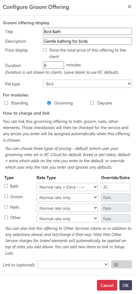 Here you can specify what services you want your customers to see when creating an online reservation for the grooming module. As it mentions below in the description, everything has to bind to a default service in KC like bath, groom, nails or Other (This is a must for invoicing and booking.)