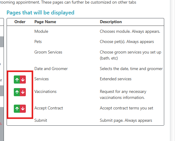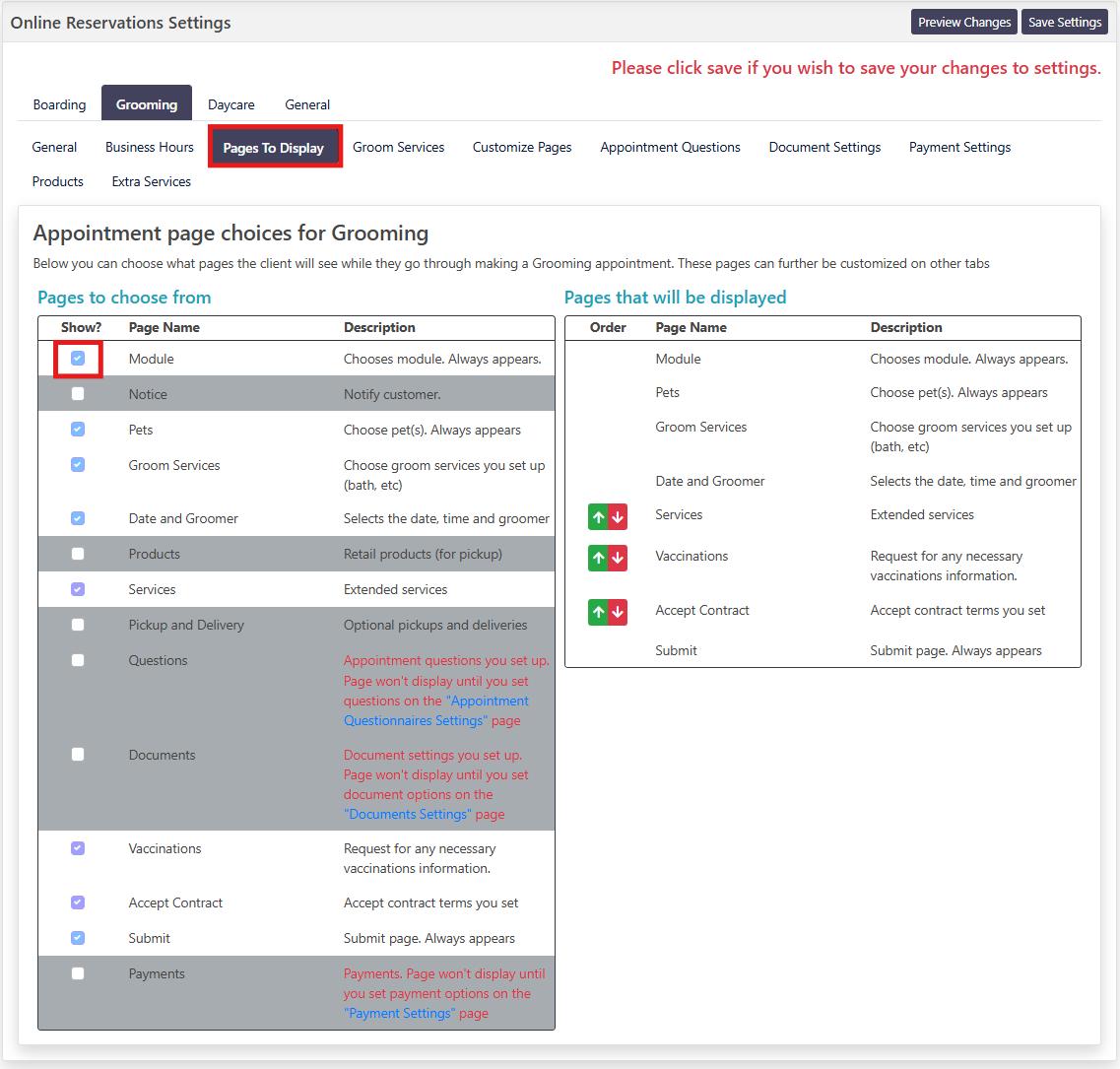Here you can choose which pages your customers will see when they make online reservations through the Client Portal. Checking the box for a page on the left will add it to the "displayed pages" on the right. Unchecked from the left will remove from the right. Whichever pages are showing on the right, your customers will see while making reservations.