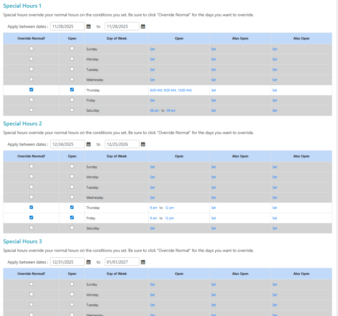 Here you can set your default business hours for this module or if you already have them entered in KC desktop and all modules operate under the same hours you can copy them from there. It also gives you three different sets of special hours which are hours that are different than your normal business hours and enabling those will overwrite your default hours for the date range selected. This is beneficial for Holidays or other circumstances that may warrant special hours.