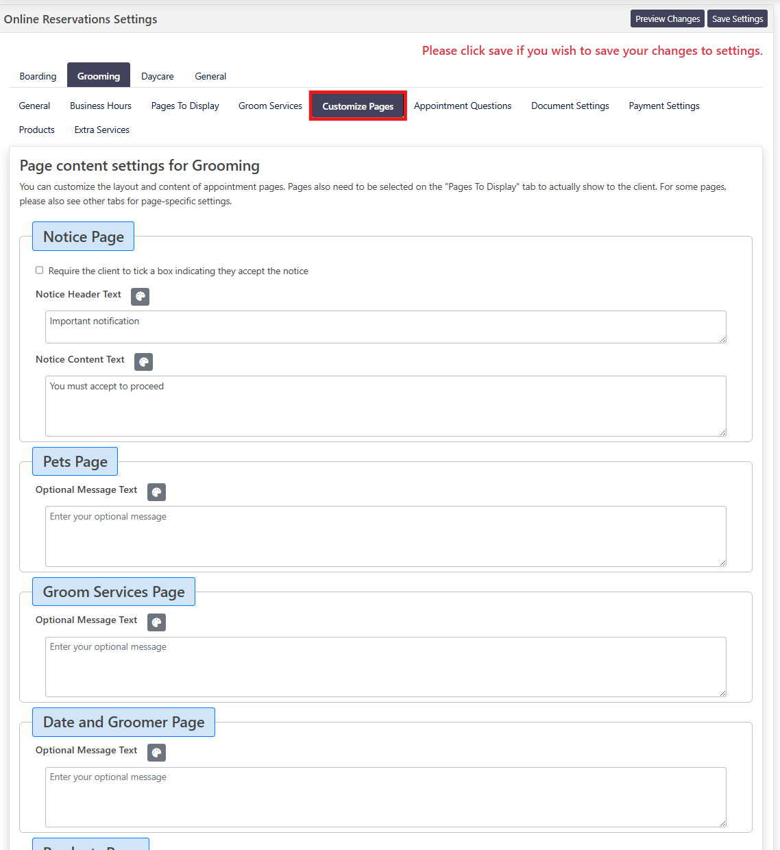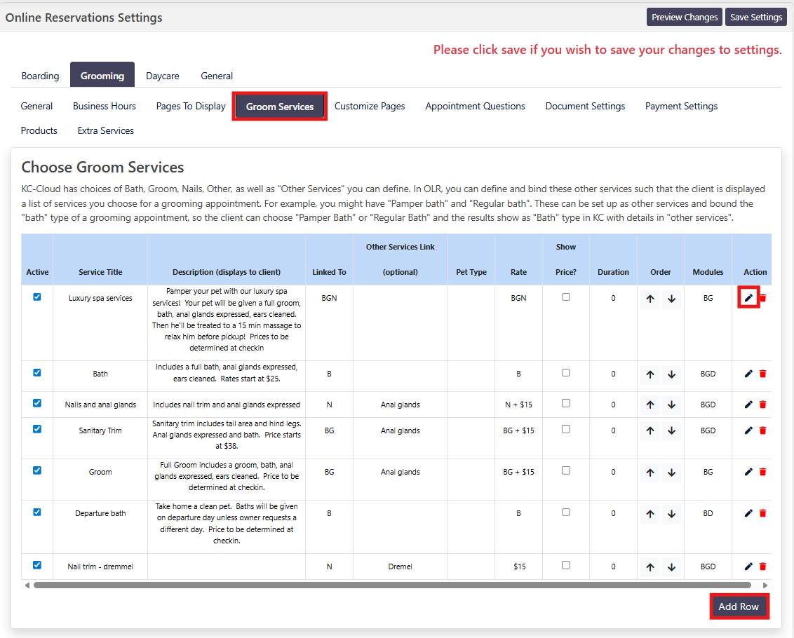 To start using the OLR system, you'll first want to go through each setting and enable/disable/add/remove or modify what you need to allow your system to run efficiently for your business. Here is a quick overview of the Grooming settings pages.