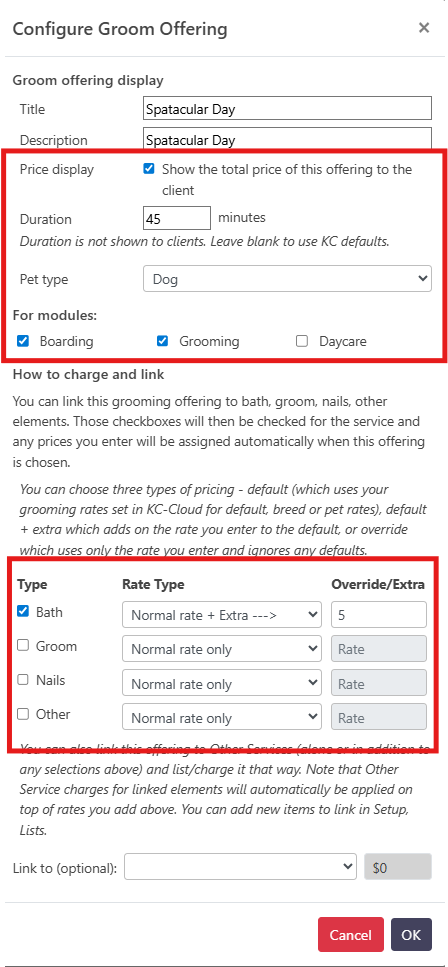 Here you can see I created an offering called "Spatacular Day" with a description. I chose to display the price and set the duration. I then linked it to be displayed as an offering in only Boarding & Grooming and NOT Daycare.