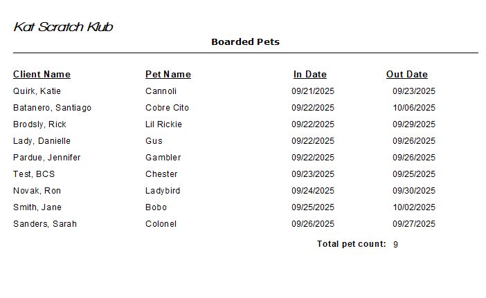 Reports, Boarding, Past boarded pets gives a list of pets who were boarding during the date range entered.  The pet has to be at least checked in or they won't show on the report.