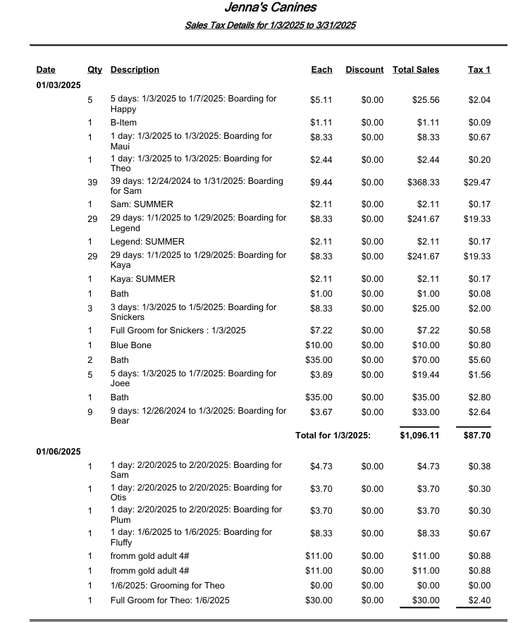 Reports, Revenue, Sales tax gives the total of sales tax taken in for the date range.