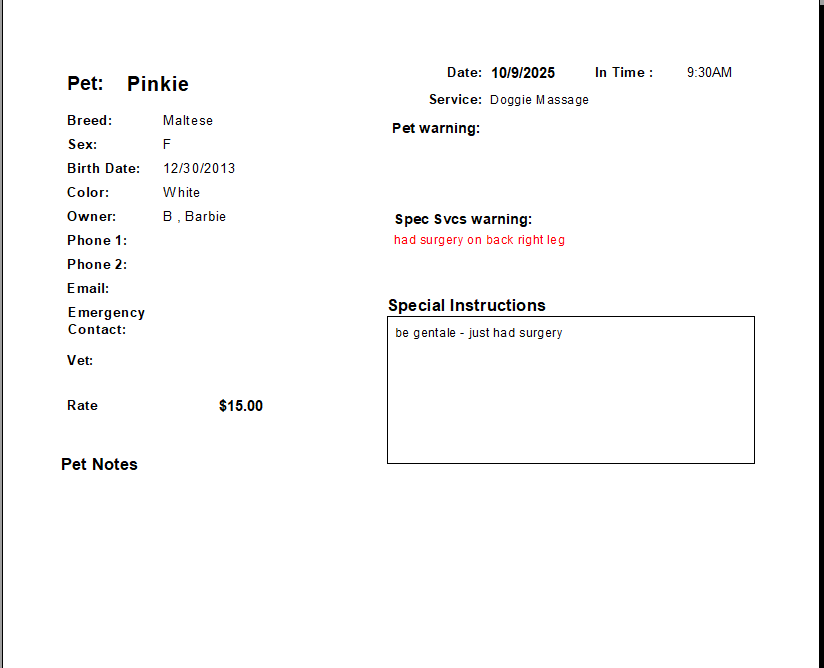 You can print the Special Services card, which will have all info for that pets appointment(s) for the day.  It will list pet info, contact info, vet info, appointment info and feed/medication/exercises.